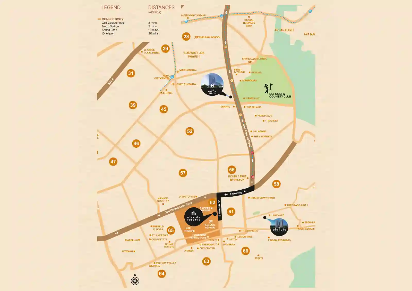 Situated on a 60-meter-wide arterial road with an impressive 85-meter frontage, Conscient SOHO at Elevate Reserve enjoys excellent connectivity to key areas of Gurgaon via Golf Course Extension Road. Surrounded by over 15,000 families and 240 premium residences within the same complex, the project ensures steady customer traffic and strong business potential.