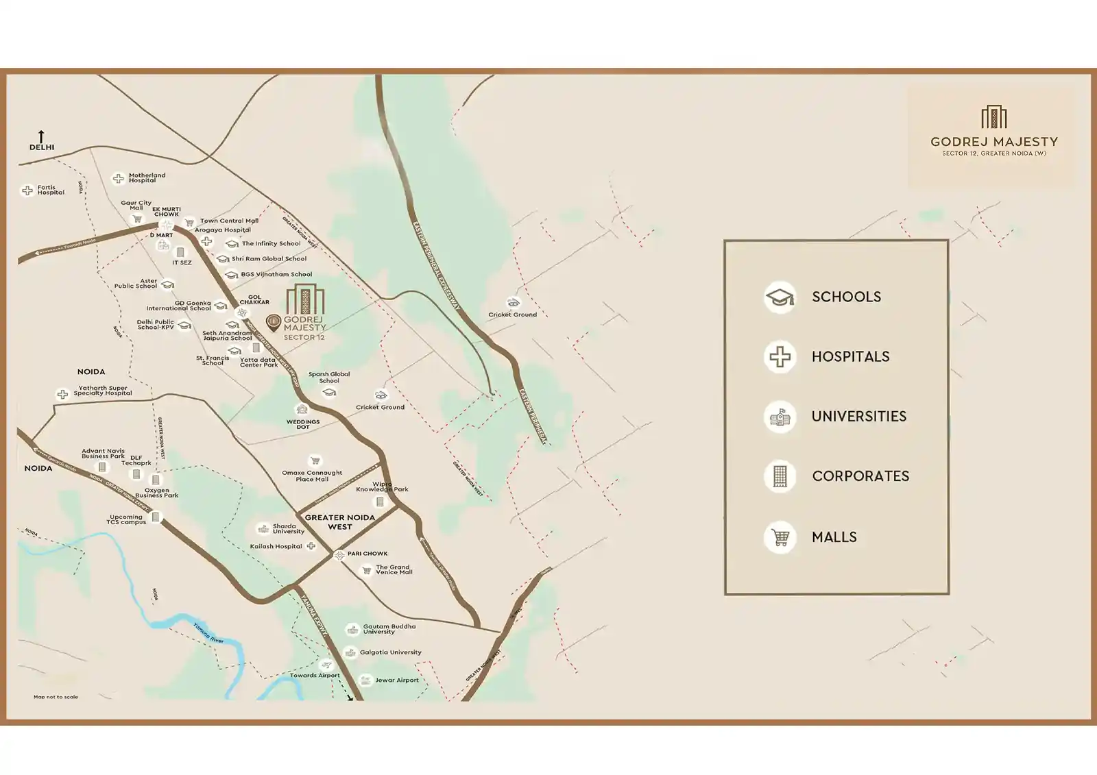 Located in Sector 12, Greater Noida West, Godrej Majesty offers smooth connectivity via the Noida–Greater Noida Link Road, Expressway, and Yamuna Expressway.