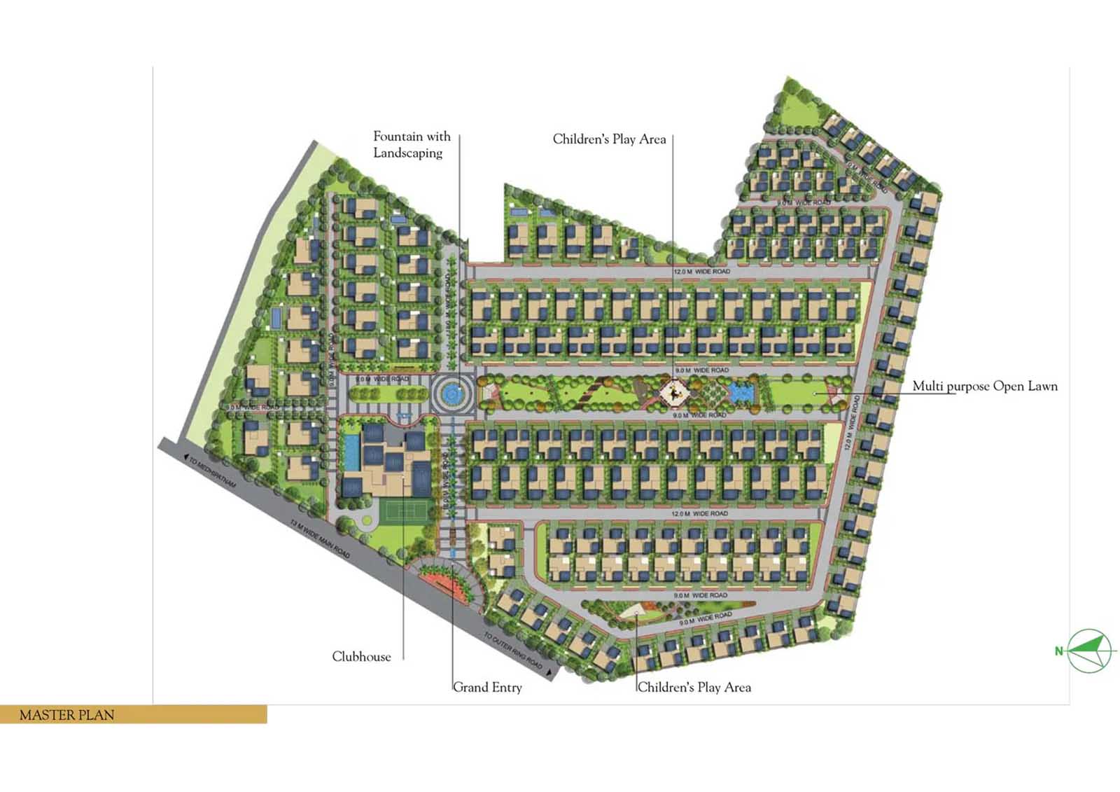 Moreover, the township includes wide 12m and 9m internal roads, landscaped parks, green open spaces, and a central avenue with water bodies. The grand entrance is beautifully landscaped, creating an impressive arrival experience.