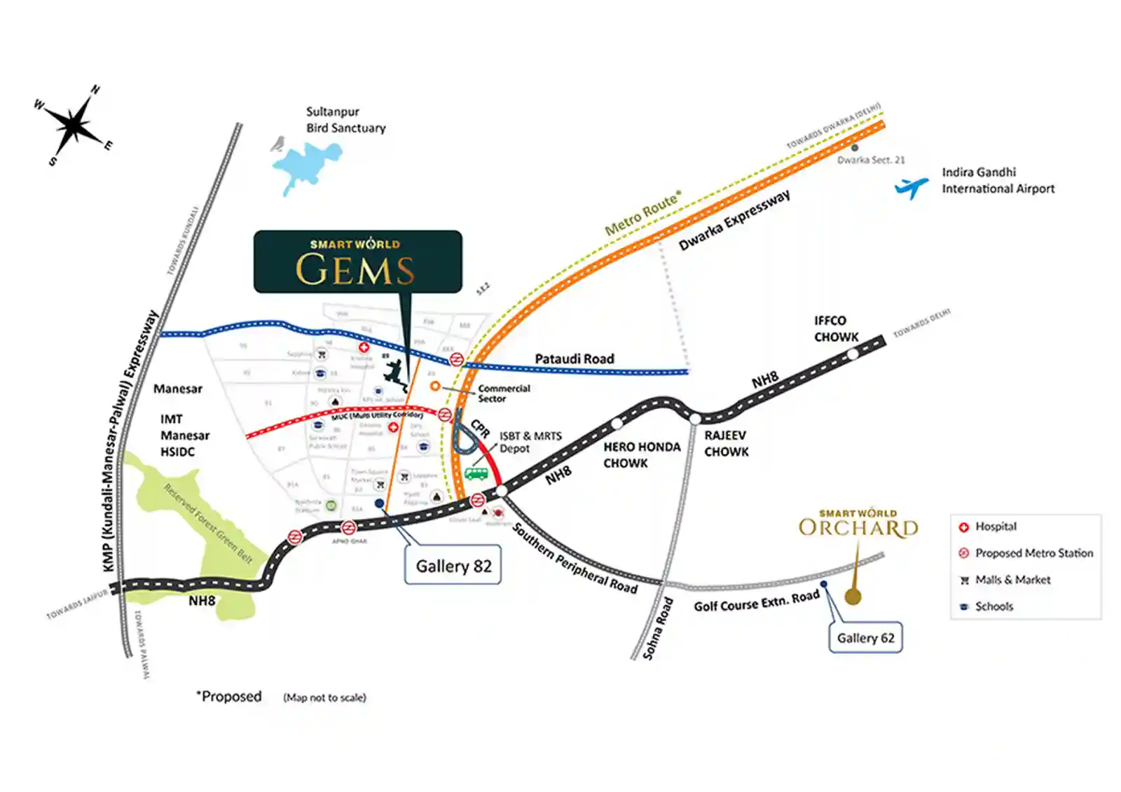 Living at Smartworld Gems means enjoying comfort in a prime location with excellent connectivity. The project offers smooth access to New Delhi through NH8, Dwarka Expressway, and Central Peripheral Road. With schools, hospitals, malls, and entertainment options nearby, it is the perfect place for a modern lifestyle.